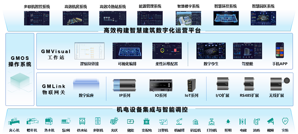 建筑機電領域專屬的開放式 GMOS 操作系統(tǒng),并以之為核心推出樓宇智控系統(tǒng),包含物聯網關、工作站、行業(yè)解決方案,徹底解決設備聯接調試周期長、工程需每單 定制的行業(yè)難題,實現對建筑內機電設備的集中監(jiān)控和智慧管理。