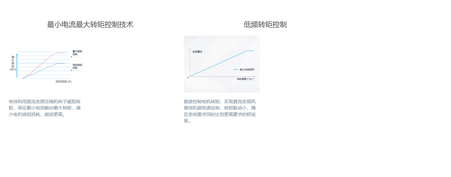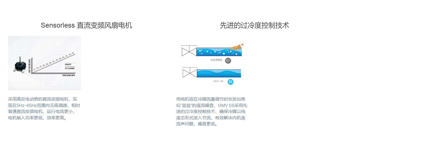 全直流變頻技術、永磁同步電機、直流變頻壓縮機、過冷度控制技術、180°正弦波直流變頻技術、雙節能運行模式、制熱不換向回油